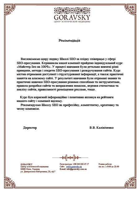 «Около 6 месяцев платил раскрутчику 3 000 гривен за ТОП-10. Возникло желание повысить эффективность своего сайта и увеличить поток клиентов. За 3 недели мне интересно, креативно и доступно рассказали, как раскручивать сайты. Теперь я вкладываю в свой сайт не 3 000, а 1 500 гривен. И в ТОП-5 по высокочасточтным. Спасибо, успехов и процветания Вам.» Владимир.