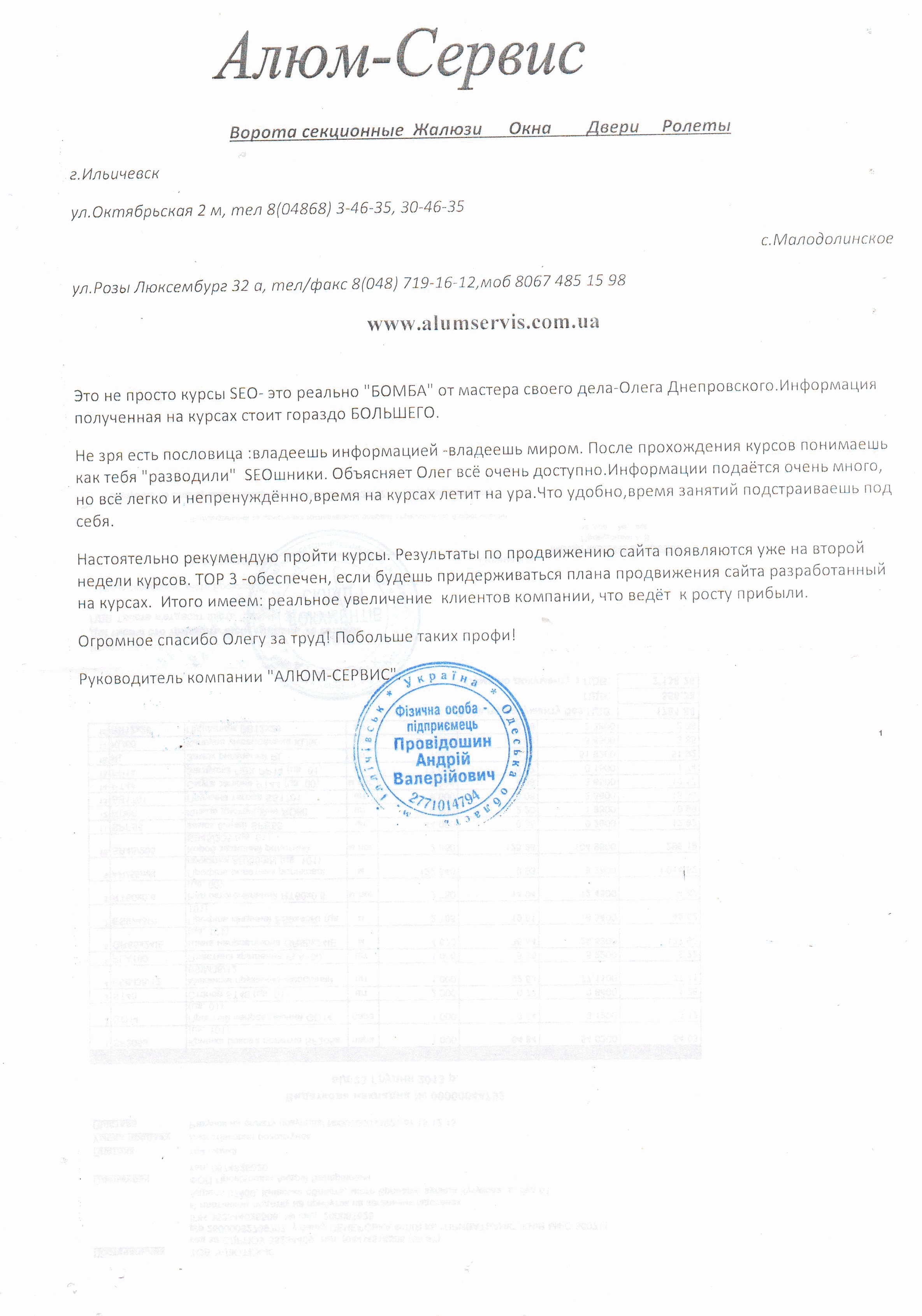 Висловлюємо щиру подяку Школі SEO за плідну співпрацю у сфері SEO-просування. Керівником нашої компанії пройдено індивідуальний курс «Майстер Seo на 100%». У процесі навчання були детально вивчені різні принципи, методи і секрети SEO-просування і розкручування сайтів. Курс містив отримання доступної і структурованої інформації, а також практичні заняття на власному сайті. У результаті навчання були отримані знання та практичні навички SEO-просування різними способами та інструментами, правила розробки сайтів та виправлення помилок, ведення статистики та аналізу сайтів, правильності розміщення реклами, тощо.